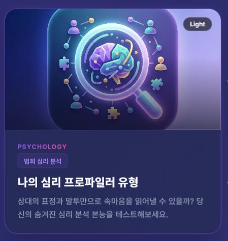 MBTI만 있던 시대는 지났습니다. 무료심리테스트로 성격, 연애, 직업, 대인관계 등 다양한 영역을 한 곳에서 분석할 수 있는 성격테스트사이트가 인기예요.