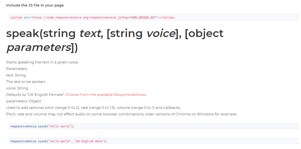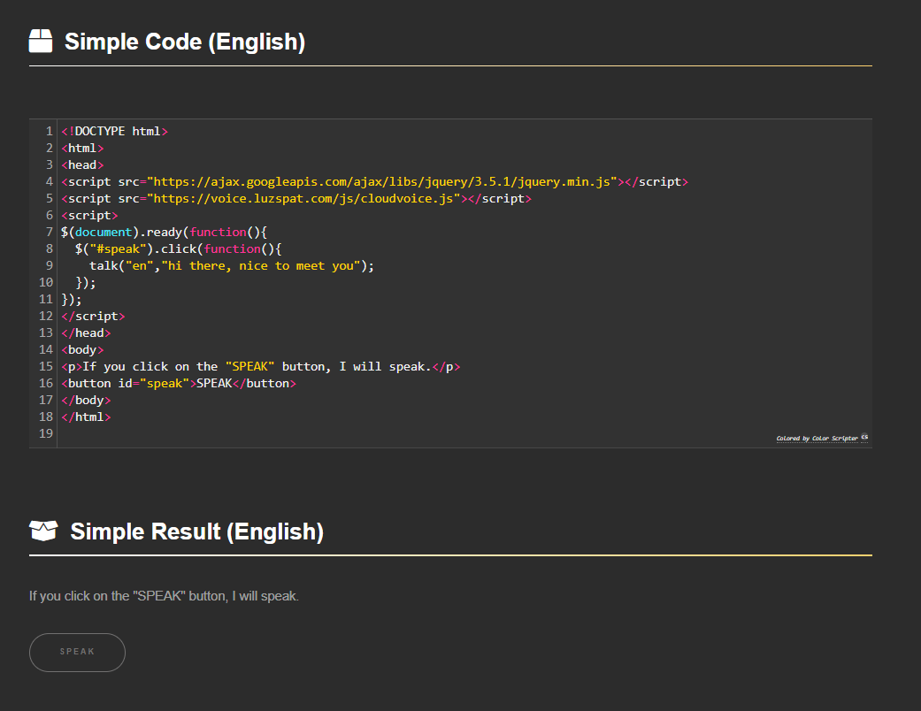 Luzspat Javascript TTS API는웹사이트에 음성 지원 가능 서비스로 만들 수 있습니다. 1줄의 javascript 코드로 사이트를 말하게 만들 수 있습니다. Text To Speech 기능을 제공하는 Luzspat Javscript TTS API를 지금